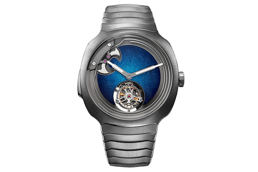 The Streamliner collection looks like where watch designer Gérald Genta’s mind might have run if he’d been working for H. Moser & Cie. With its clear “luxury sports watch” inspiration and scale-like bracelet, the Streamliner Concept Minute Repeater Tourbillon Blue Enamel artfully combines 1970s industrial design influence with more organic forms in a timepiece whose sportiness belies its complicated nature. Indeed, this is a watch that features both a minute repeating complication and a tourbillon. The hammers and gongs, which sound the time upon activation of a button, had to be specially formulated to compensate for the acoustic characteristics of a rectangular case. The blue enamel dial, devoid of any indications save the hands, is a picture of restraint, while the hand-wound HMC 905 movement boasts no fewer than 400 components. Now, here’s a watch that truly looks like nothing else on the market!