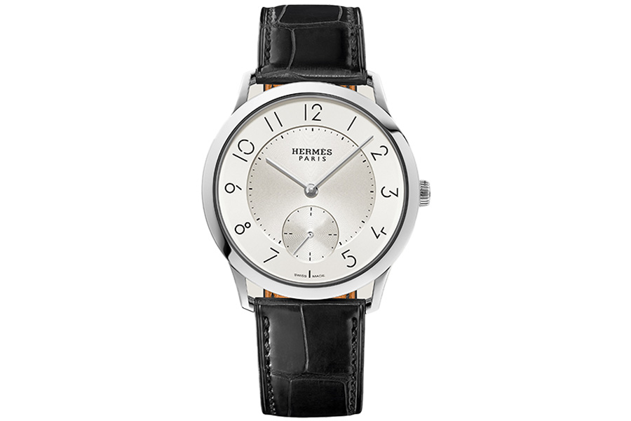 From the watchmaking division of French luxury maison Hermès, the Slim d’Hermès sets an opaline silvered dial within a 39.5mm stainless steel case. Made in Switzerland, it’s the timepiece’s artistic numerals — from custom-designed typography by Philippe Apeloig — along with its sunburst chapter ring and snailed small-seconds counter, that distinguish its design language. Inside the slender watch is Hermès’s self-winding H1950 movement. Famous for its leather goods, Hermès incorporates a matte black alligator leather strap here.