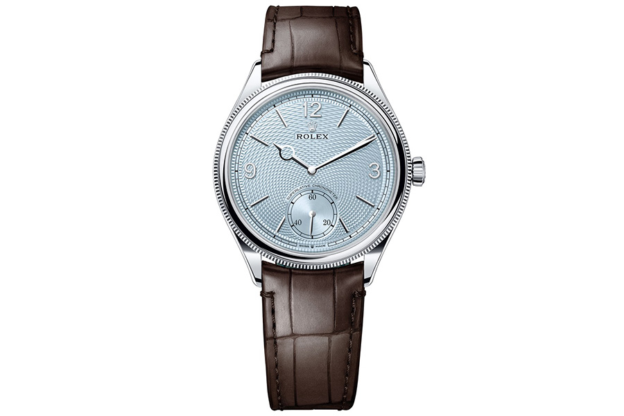 Though introduced in 2023, the Rolex 1908 looks to the illustrious dress watch heritage of the Swiss powerhouse — and draws inspiration from one of the first Rolex watches fitted with the Perpetual rotor. With Reference 52506, a 2024 release, Rolex paired a well-sized 39mm polished platinum case with an ice blue dial that features a guilloché rice-grain motif (explore guilloché watches here). Quietly eye-catching, these details showcase the restraint required of a dress watch. Further, the domed, finely fluted bezel and the brown alligator leather strap demonstrate Rolex’s commitment to subtle refinement. The 1908 features the manufacture’s high-performance-calibre 7140 movement.
