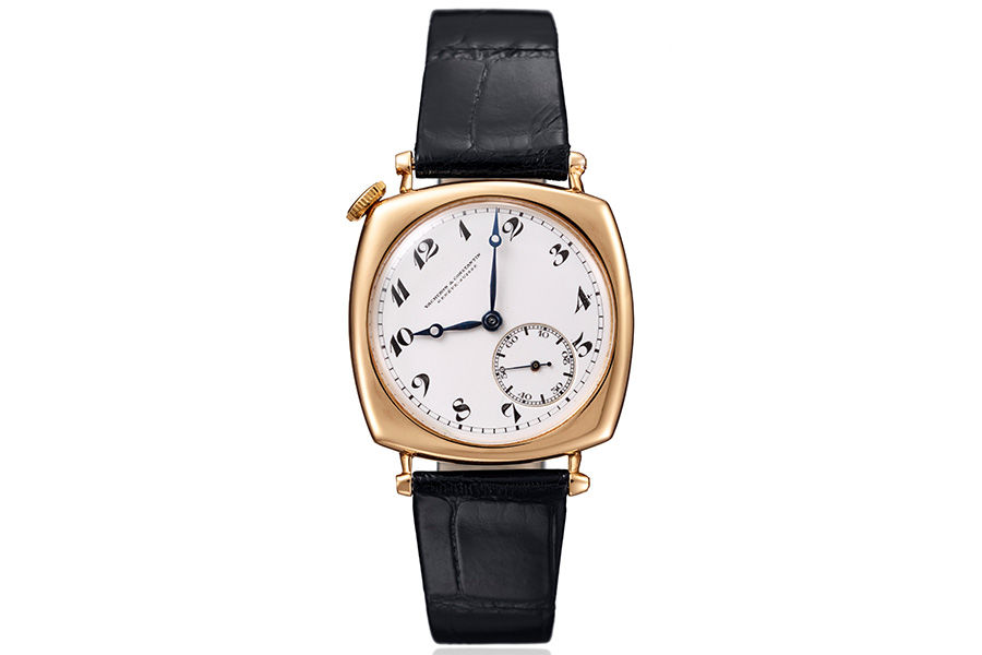 Based on a model originally designed for driving, and featuring a distinct diagonal time display meant to be read on a wrist holding a steering wheel, Vacheron Constantin’s Historiques American 1921 manages to be expressive while maintaining a sense of elevated sophistication (read about the intersection of cars and timepieces in our guide to luxury racing and automotive-inspired watches). The cushion-shaped case, composed of pink gold, is complemented by a grained, silver-toned dial with small seconds at 3 o’clock. The slender, open-tipped hour and minute hands are crafted from blackened 18K gold, which pair well with the black-painted Arabic numerals. The Historiques American 1921 runs on a hand-wound Caliber 4400 AS movement. Despite the unique geometry and the unexpected position of the crown, there’s a visual balance that secures this timepiece in the dress watch category.