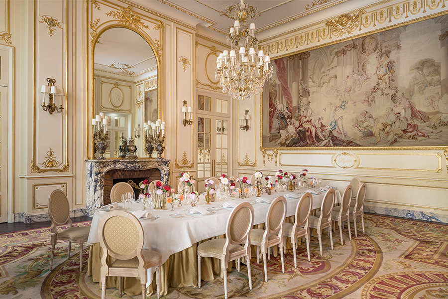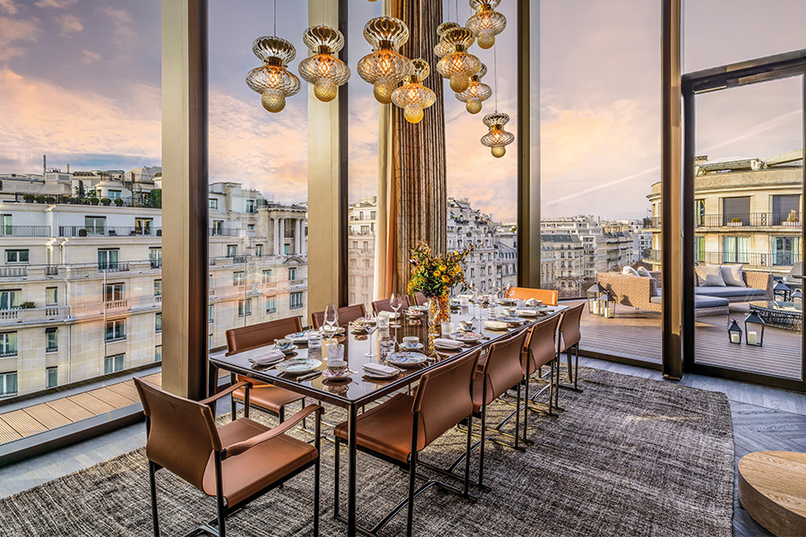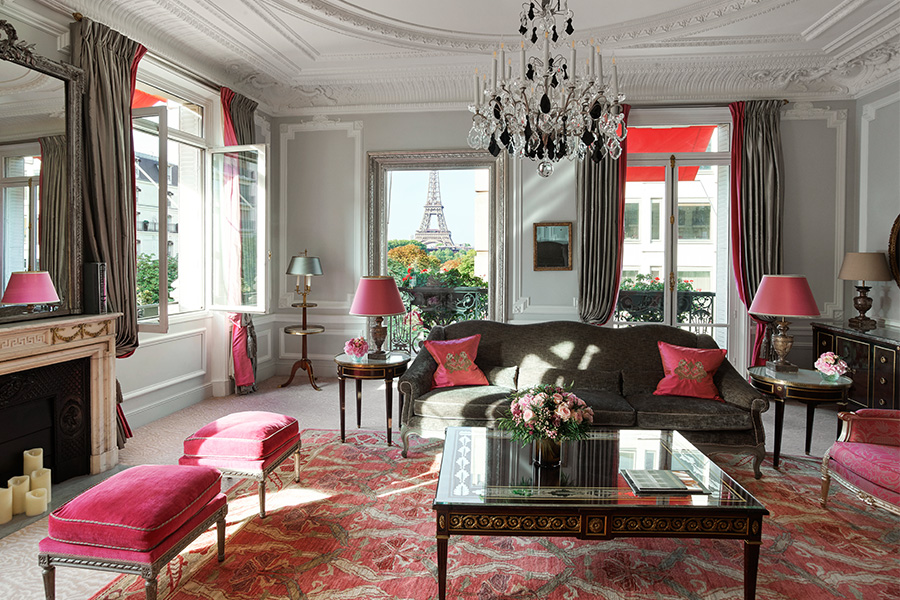 Hôtel Plaza Athénée pays tribute to its stylish storefront surroundings on Avenue Montaigne with a Dior Spa, a glamorous retreat that uses proprietary techniques for treatments that include light therapy, Hydrafacials, and body masks. The hotel’s Michelin-starred restaurant, Jean Imbert au Plaza Athénée, evokes a stately banquet hall with its centerpiece Royal Table in antique Breccia pink marble under gold-gilded crown molding.