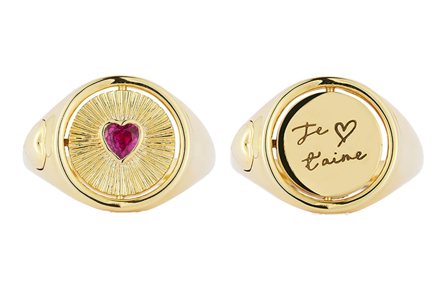 This style from Jemma Wynne is dynamic with a spinning crest; the front has a bezel-set, heart-shaped ruby, and the back reads je t’aime, or “I love you” in French — making it a romantic Valentine’s Day gift. It’s handmade in Jemma Wynne’s New York studio, which showcases the brand’s love and dedication to every piece.