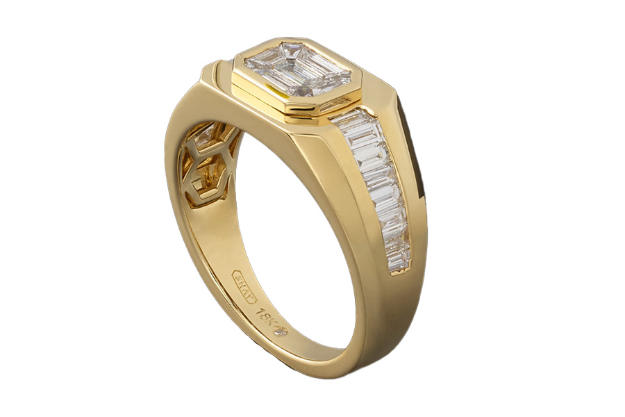 Shay Jewelry creates Victorian- and Art Deco–inspired designs by hand in Los Angeles. This ring is a fantastic choice for the man who wants a bold piece with an interesting, geometric design. The front has a horizontally oriented, elongated octagon shape with an octagon-cut diamond at its center and baguette-cut diamonds set into half the band.